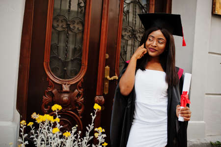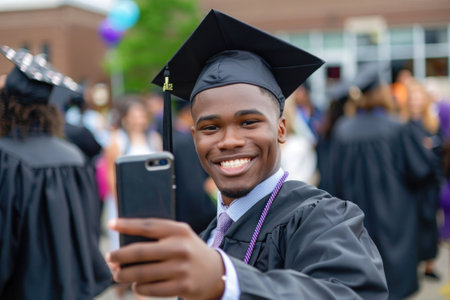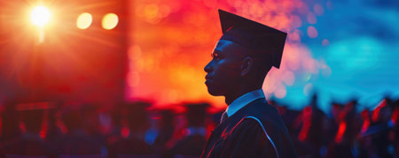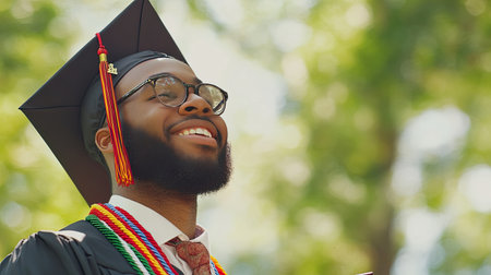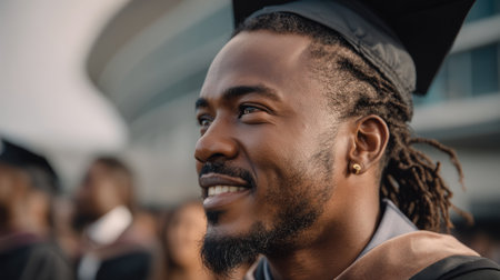 Triumphant milestone! Black college grad in cap and gown. Inspiring achievement captured. Celebrate success.