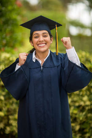 Title Cute Young woman in her graduation cap and gown showing excitement after graduating. Beautiful girl showing real emotion after finishing her degree
