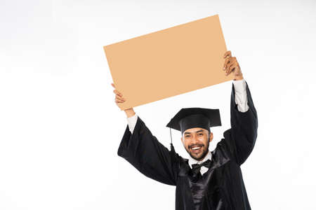 Male graduate student wearing toga holding cardboard blank space on isolated background