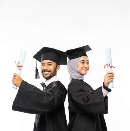 Smiling graduate boy and girl in black toga holding rolls of certificate standing on isolated background