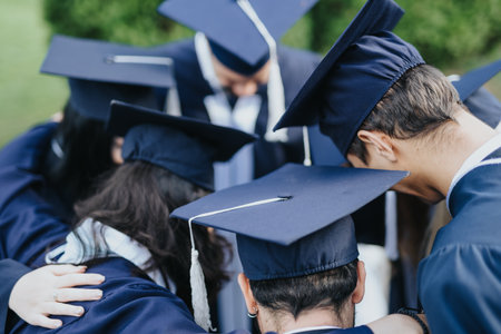 Diverse university students celebrating their academic achievement, sharing happiness, and creating positive memories in a park.