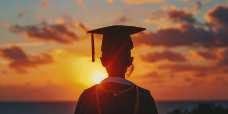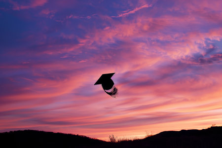 A graduation cap flying in the air against a stunning sunset backdrop, A graduation cap tossed in the air against a beautiful sunset sky