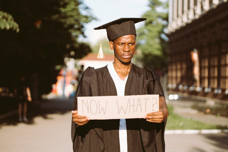 Portrait of poor afro american guy holding cardboard poster and lending hand on street. Looking for job, hiring and employment issue. University or college graduating student in graduate gown and cap