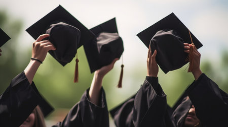 Finally graduated Closeup of four hands holding mortar boards against sky background : Generative AI