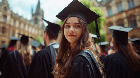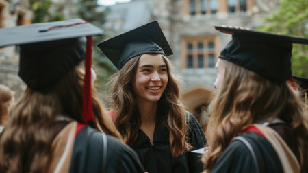 elebratory Graduation Day at Prestigious University, Smiling Graduates in Caps and Gowns.