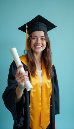 A proud young graduate in a cap and gown, holding a diploma, with a warm smile.