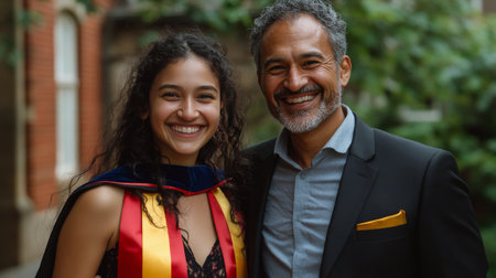 A young woman wearing a graduation gown and colorful hood stands next to an older man, both smiling joyfully in an outdoor setting, capturing the pride of academic achievement.