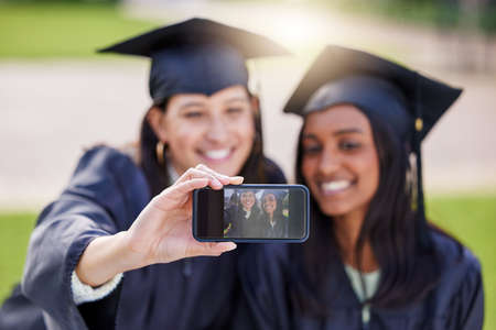 One more for the road. two attractive young female students taking selfies while celebrating on graduation day.