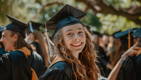 Foregrounded young girl among jubilant graduates in outdoor setting