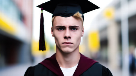proud graduate gay man wearing academic gown and cap, adorned with a rainbow scarf, representing academic achievement and LGBTQ pride, smiling confidently. High quality photo