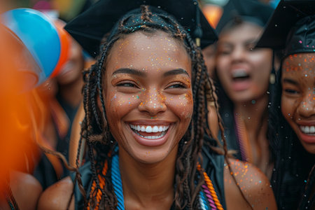 A joyful young graduate smiles brightly surrounded by friends during a graduation ceremony. The moment captures celebration and accomplishment in a vibrant outdoor setting.