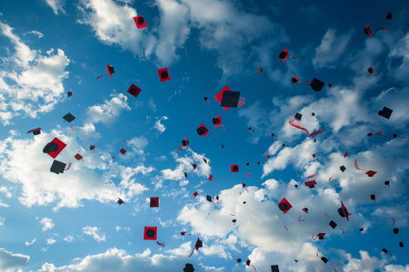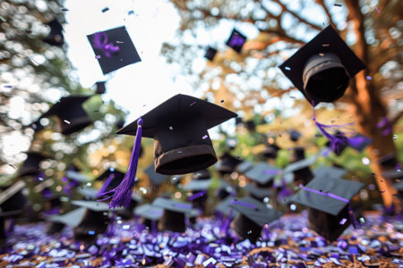 Experience the exhilarating moment of a graduation celebration as graduates throw their caps in the air at a prestigious university amidst confetti and joyful cheers A symbol of academic achievement and the excitement of new beginnings