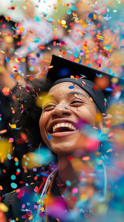 Joyful African American graduate with confetti, embodying celebration and bright futures.