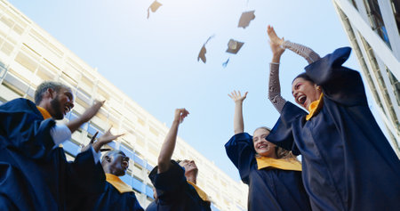 Graduates, throw and hats for graduation success, education achievement or diploma goals. City, excited people or academic cap in air for celebration, low angle or learning with university target