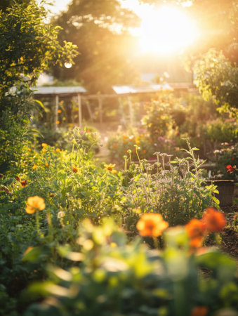 A soft-focus view captures colorful flowers and lush vegetables thriving in the garden, illuminated by golden rays of the sun on a beautiful day.