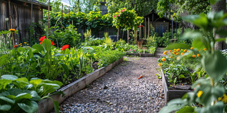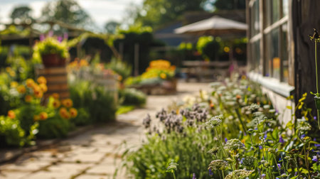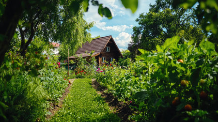 Charming garden pathway leads to cozy house, surrounded by vibrant flowers and lush greenery. warm sunlight enhances inviting atmosphere, creating serene outdoor space