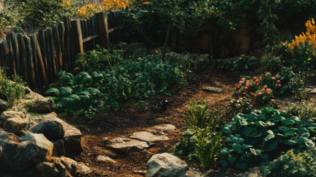 A serene vegetable garden featuring vibrant flowers and lush greenery, surrounded by rustic rocks and a wooden fence, perfect for nature lovers.