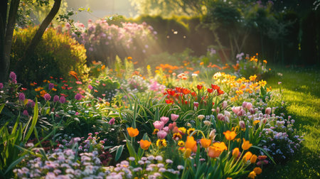A beautiful and vibrant garden with a variety of blooming flowers, representing the joy of nature
