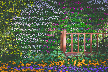 Wooden stairs prop with vertical garden of multi-colored Madagascar periwinkle and sunflowers
