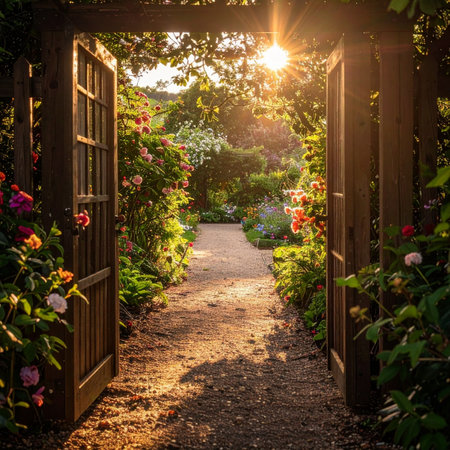 An open wooden gate reveals a path into an enchanting secret garden, bathed in the warm, golden light of a setting sun.