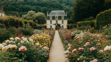 A formal garden with rows of blooming flowers leading to a classic French house, ideal for serene scenes.
