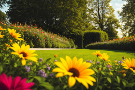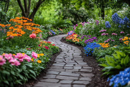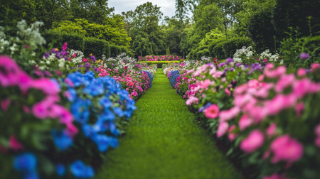 Scenic garden path with colorful flowers blooming on each side, creating a vibrant and peaceful atmosphere