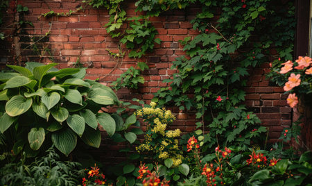 Garden in front of a brick wall with green leaves and flowers