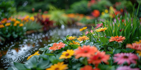A serene garden pond surrounded by colorful flowers, creating a tranquil and picturesque outdoor scene.