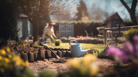 Generative AI, Beautiful summer private garden with many flowers and plants, nature landscape, english countryside cottage style