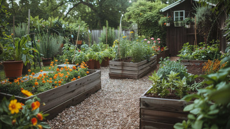 garden with a permaculture design, with plants and growing techniques that promote biodiversity generative ai