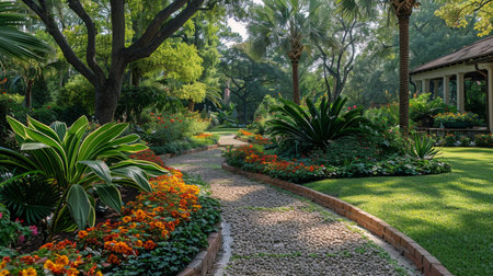 A beautiful garden pathway meanders through vibrant greenery and orange flowers, creating a serene atmosphere perfect for relaxation and outdoor enjoyment.