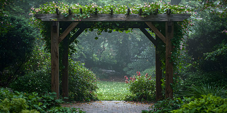 A serene wooden arbor draped with greenery leads through a lush garden, enveloped in soft morning fog, creating a peaceful atmosphere filled with blooming flowers and vibrant greenery.
