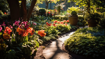 Beautiful garden pathway lined with vibrant flowers and plants, illuminated by warm glow of setting sun. scene evokes sense of tranquility and natural beauty
