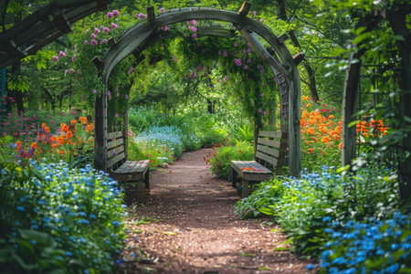 A tranquil pathway meanders through a colorful flower garden, framed by lush greenery and an elegant arbor, creating a peaceful outdoor escape.