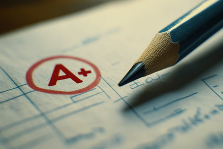 Pencil on homework with a plus grade in sunlit classroom.
