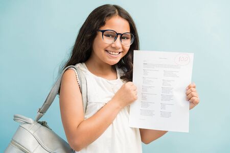 Happy Latin girl showing her perfect test results while making eye contact in studio