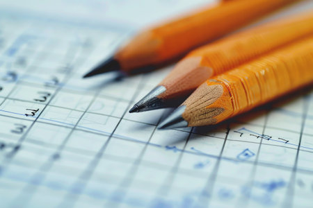Three pencils are on a piece of paper. The pencils are sharpened and have a pointed tip. The paper is a grid with numbers and letters