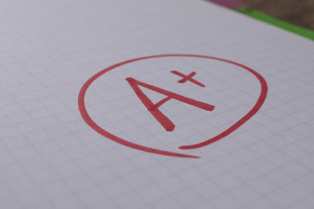 A+ Grade on Exam Paper with Red Pen on White Background
