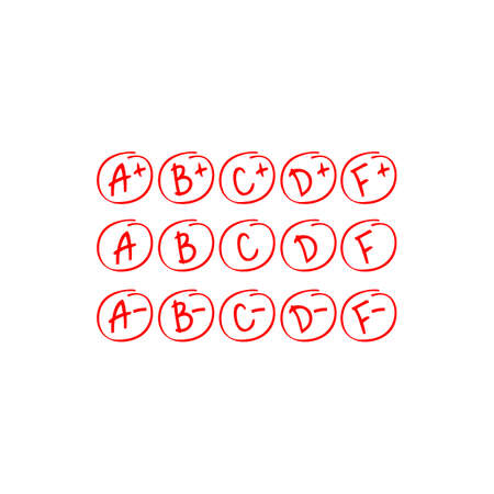 School grades (A to F) drawn with black crayon, chalk or pastel texture on blackboard. Hand-drawn red marks in rough circles, resembling teachers grading on student assignments. Vector illustration