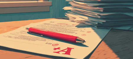 Stylized POV of Red Pen on A Graded Test on Teachers Desk