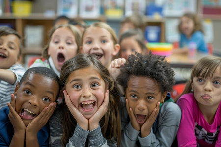 Group of joyful diverse kids showing various expressions in a classroom setting