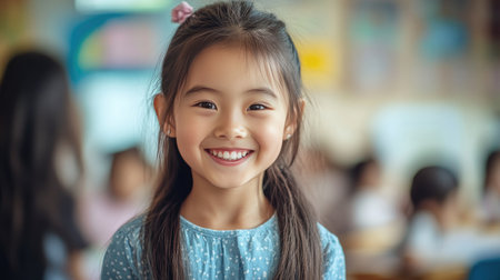 Portrait of a smiling 8-year-old Asian girl in a classroom, captured with natural light, showing her joy in learning