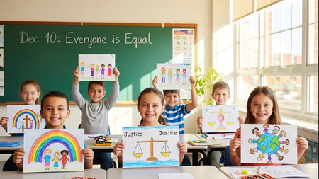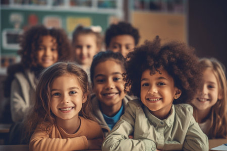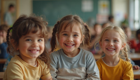 Happy children in classroom smiling enthusiastically in bright learning environment.