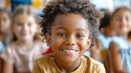 Happy Smiling Child in Classroom with Group of Diverse Kids in Background.