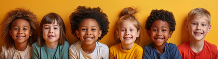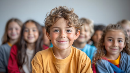 A diverse group of children, ranging in ages and ethnicities, standing next to each other in a row. They are all looking towards the camera with smiles on their faces, creating a heartwarming and inclusive scene.