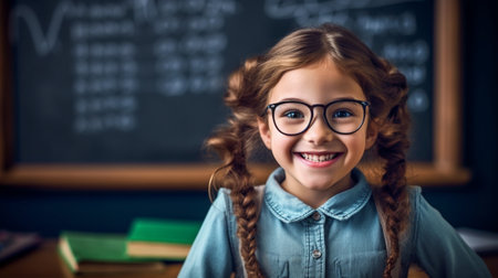 Portrait of happy schoolgirl with glasses against blackboard in classroom