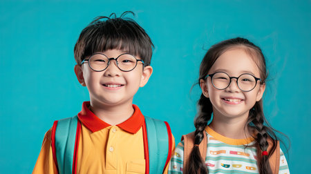 Back to school concept. Portrait Young boy and girl with dark hair and round glasses happy funny cute little child boy and girl smiling and laugh hug books, studio shot isolated blue background. Kid from preschool kindergarten with school bag education - AI Generated.