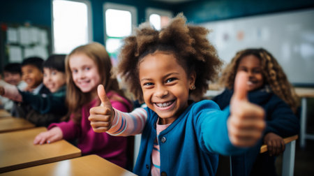 Enthusiastic Students Giving Thumbs Up in Classroom, Celebrating Success and Friendship Together