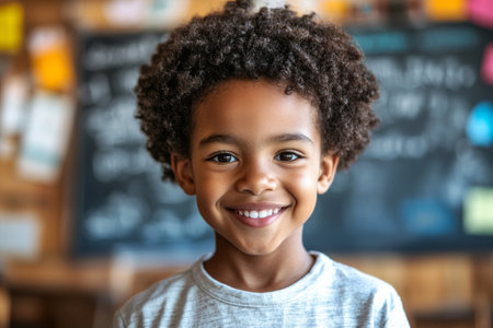 Young Afroamerican boy smiling joyfully in a classroom with a colorful chalkboard in the background filled with drawings and notes during school hours