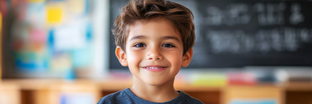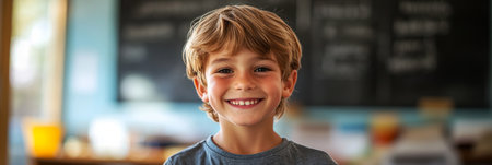 Joyful young European boy smiles brightly while participating in a classroom full of classmates, engaging in lively discussions and activities during school hours, banner